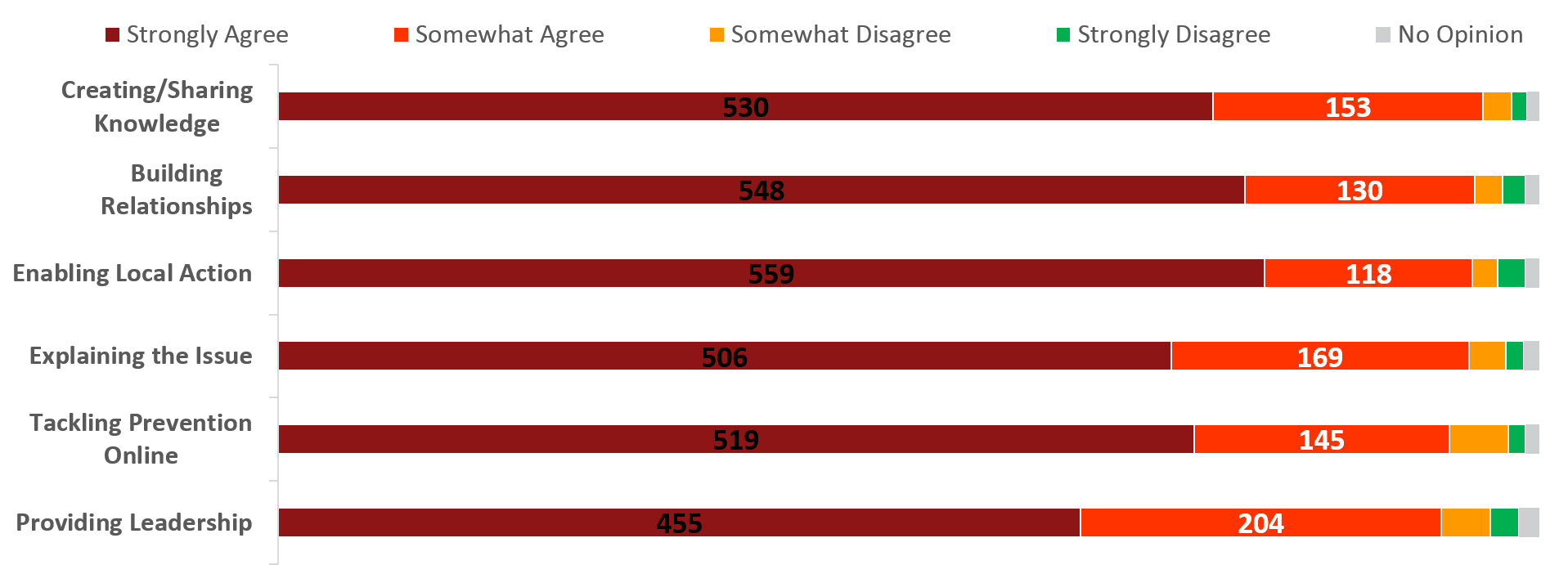 In the area of Creating/Sharing Knowledge 530 Respondents strongly agreed this should be an area of focus for the Canada Centre, 153 somewhat agreed, 16 somewhat disagreed, 9 strongly disagreed, 7 had no opinion.