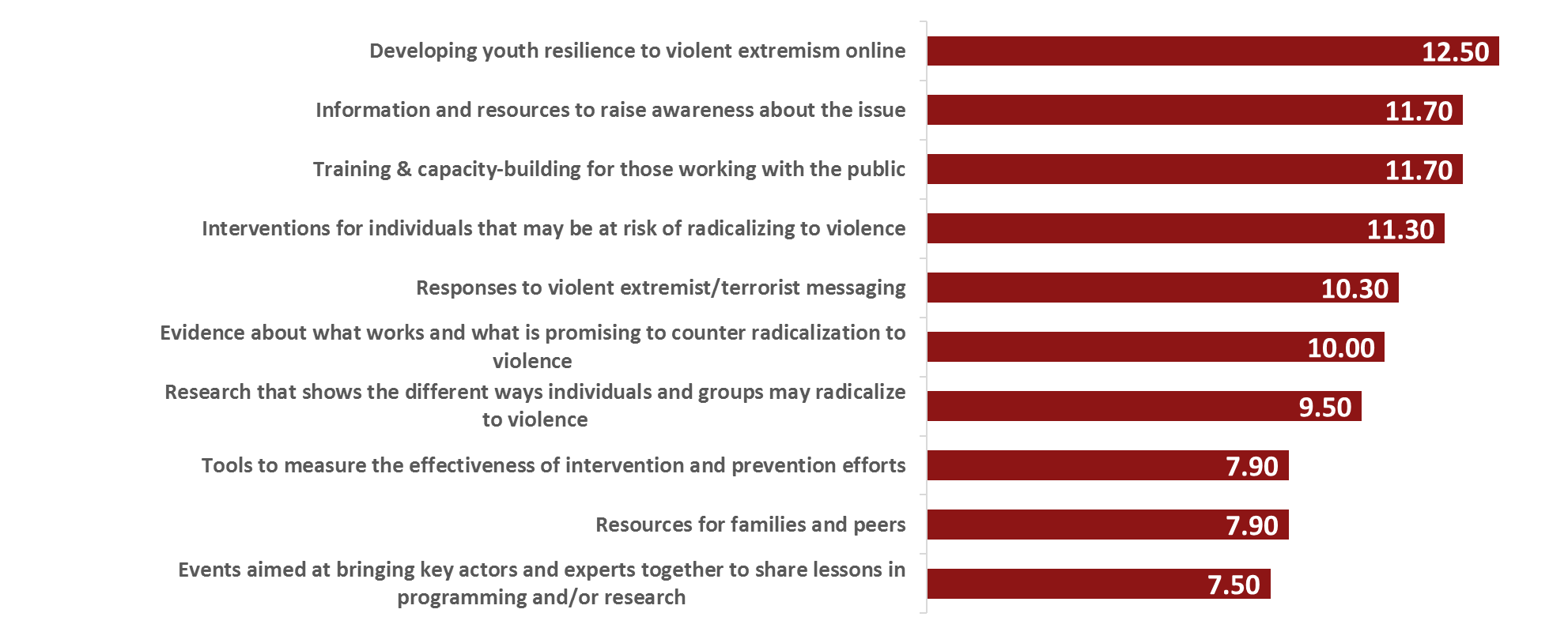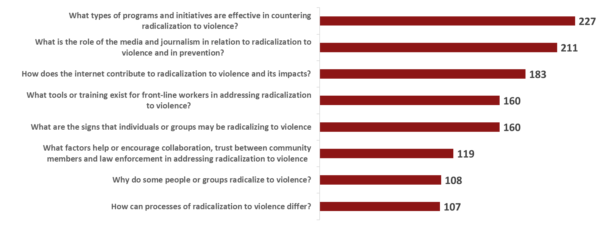 The online consultation presented a number of areas of potential focus for the Canada Centre in fostering national cooperation on countering radicalization to violence. Contributors were presented with definitions explaining these key themes, and were asked which they considered should be the focus for the Canada Centre. These included: