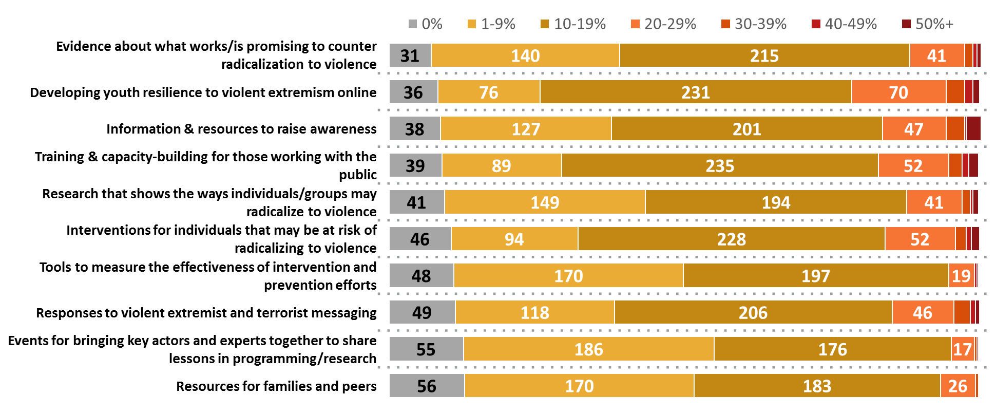 The second stacked bar graph is titled Total % of resources for CRV and shows participating professionals and organizations level of effort/resources associated with countering radicalization to violence.108 organizations answered that they spent 1-24% of resources on CRV, 50 spent 25-49%, 33 spent 50-74%, 16 spent 75-99%, and 25 spent 100%.