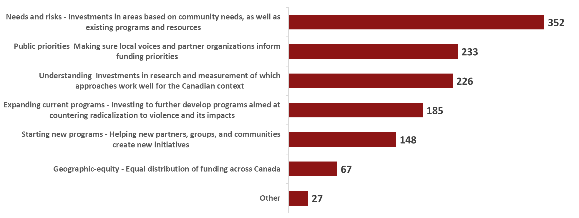 Overall, contributors supported the suggested areas of focus for the Canada Centre as well as the national strategy on countering radicalization to violence. Few respondents suggested additional areas for consideration, however some stressed relevant measures for broad prevention of radicalization, or mentioned necessary ideological shifts around diversity or group identity or changes within society which they thought could be achieved through public education/awareness campaigns.