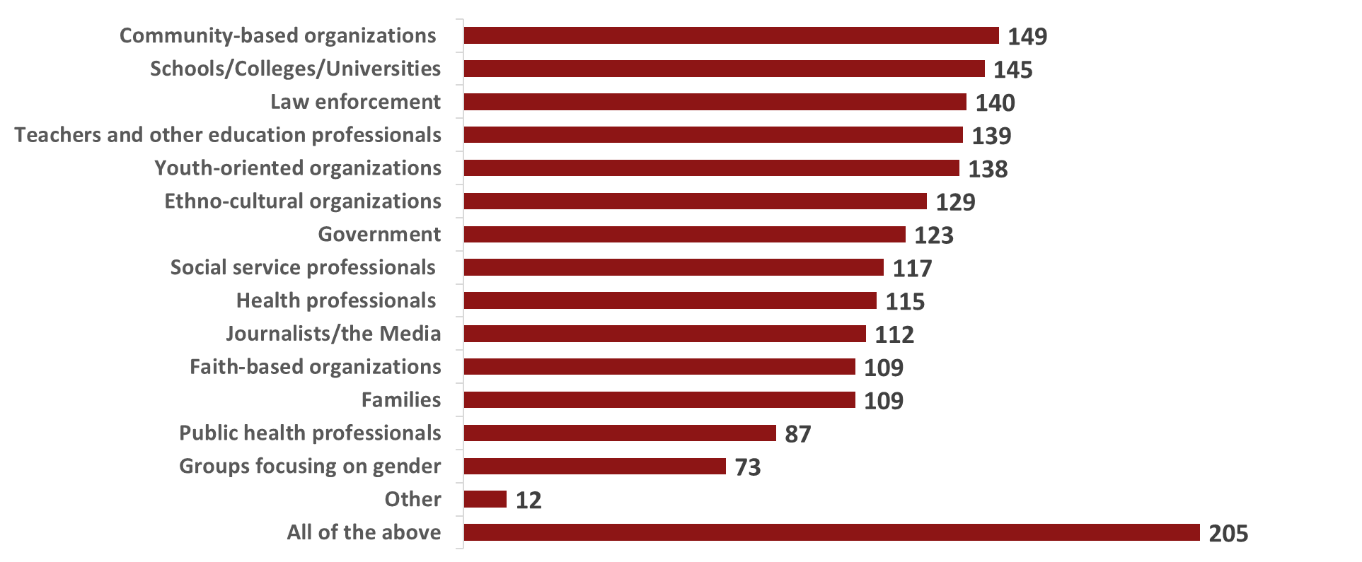 There were various ways presented to address these audiences including through schools/universities, community centres, social media, families/parents/guardians, and social services. Some also highlighted a need for this audience to be particularly focused on young people in marginalized or minority communities. Other suggested audiences included academics, Indigenous communities, and minority communities who are at risk for radicalization.