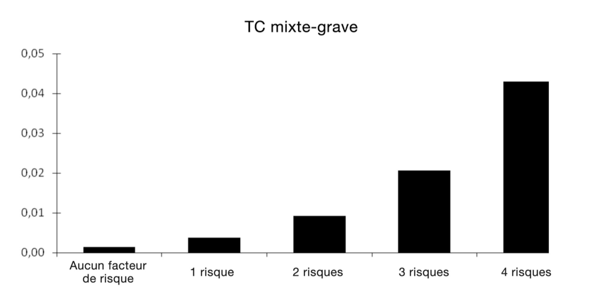 Sur l'axe X, de gauche à droite, on trouve le nombre de facteurs de risque présents; l'échelle va de aucun facteur de risque jusqu'à quatre facteurs de risque, et augmente par tranches de un facteur.