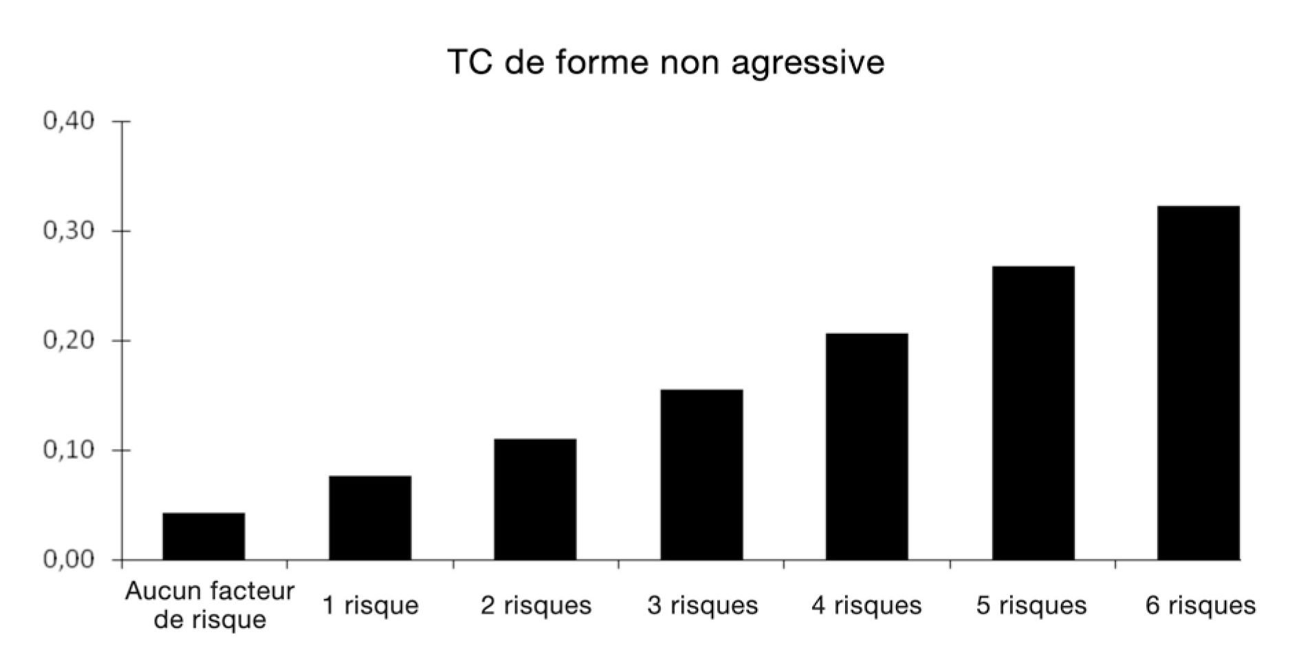 Sur l'axe X, de gauche à droite, on trouve le nombre de facteurs de risque présents; l'échelle va de aucun facteur de risque jusqu'à six facteurs de risque, et augmente par tranches de un facteur.
