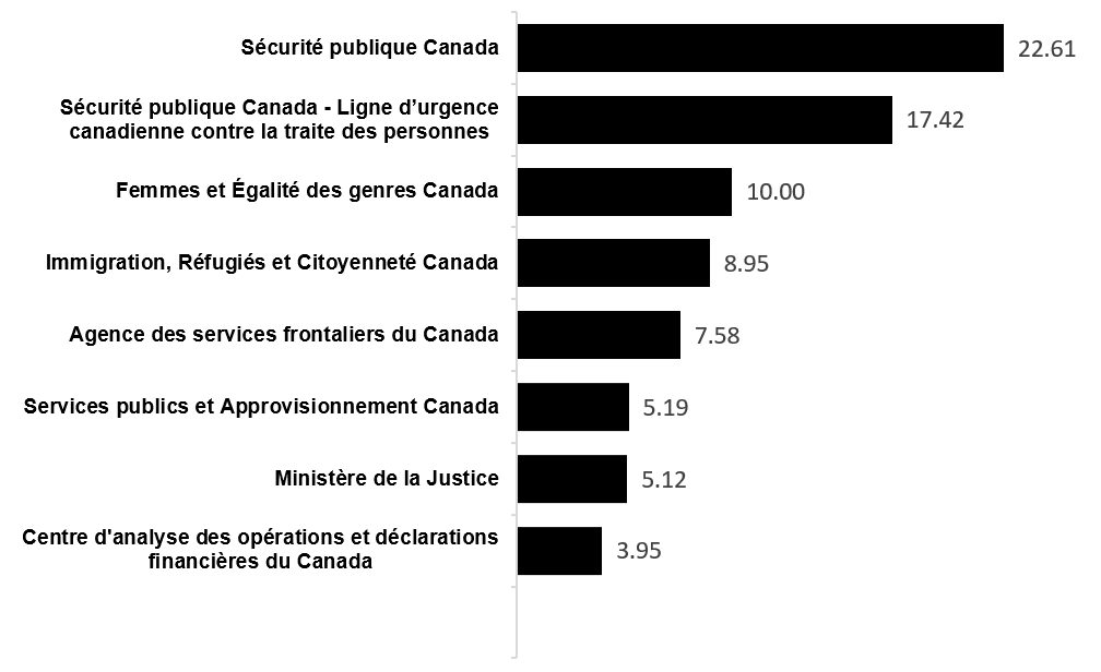 L'image montre un graphique à barres qui illustre le montant du financement du gouvernement du Canada consacré à la traite des personnes. La première barre présente le 22,61 millions financement consacré à Sécurité publique Canada. La deuxième barre présente le 17,2 millions financement consacré à la Ligne d'urgence canadienne contre la traite des personnes fournie par Sécurité publique Canada. La troisième barre présente le 10 millions financement consacré à Femmes et Égalité des genres Canada. La quatrième barre présente le 8,95 millions financement consacré à Immigration, Réfugiés et Citoyenneté Canada. La cinquième barre présente le 7,58 millions financement consacré à l'Agence des services frontaliers du Canada. La sixième barre présente le 5,19 millions financement consacré à Services publics et Approvisionnement Canada. La septième barre présente le 5,12 millions financement pour le ministère de la Justice du Canada. La huitième barre présente le 3,95 millions financement pour le Centre d'analyse des opérations et déclarations financières du Canada.