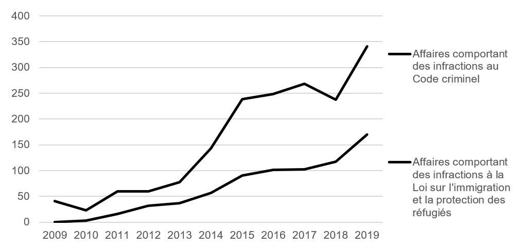 Figure 2: Comptes annuels des cas de traite de personnes déclarées par la police au Canada, par type d'infraction, de 2009 à 2019