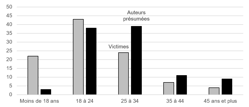 La grande majorité (soit 95 %) des victimes de la traite des personnes étaient des filles et des femmes et, dans l'ensemble, la plupart (soit 89 %) des victimes étaient âgées de moins de 35 ans (graphique 2). Plus d'une victime sur cinq (21 %) était une fille de moins de 18 ans et 43 % des victimes étaient des jeunes femmes âgées de 18 à 24 ans. Un peu plus du cinquième (22 %) des victimes étaient des femmes âgées de 25 à 34 ans.