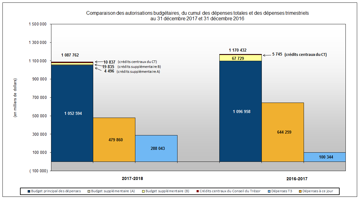 Pour le trimestre terminé le 31 décembre 2017, les niveaux d'autorisations accordés au Ministère comprenaient le Budget principal des dépenses, les Budgets supplémentaires des dépenses (A) et (B) et les transferts de crédits centraux du Conseil du Trésor. Les niveaux d'autorisations de 2016-2017 pour la même période comprenaient le Budget principal des dépenses, le Budget supplémentaire des dépenses (B) et les transferts de crédits centraux du Conseil du Trésor. L'État des autorisations indique une diminution nette de 82,6 M$ (7,1 %) par rapport à celles de la même période l'année précédente (de 1 170,4 M$ à 1 087,8 M$).