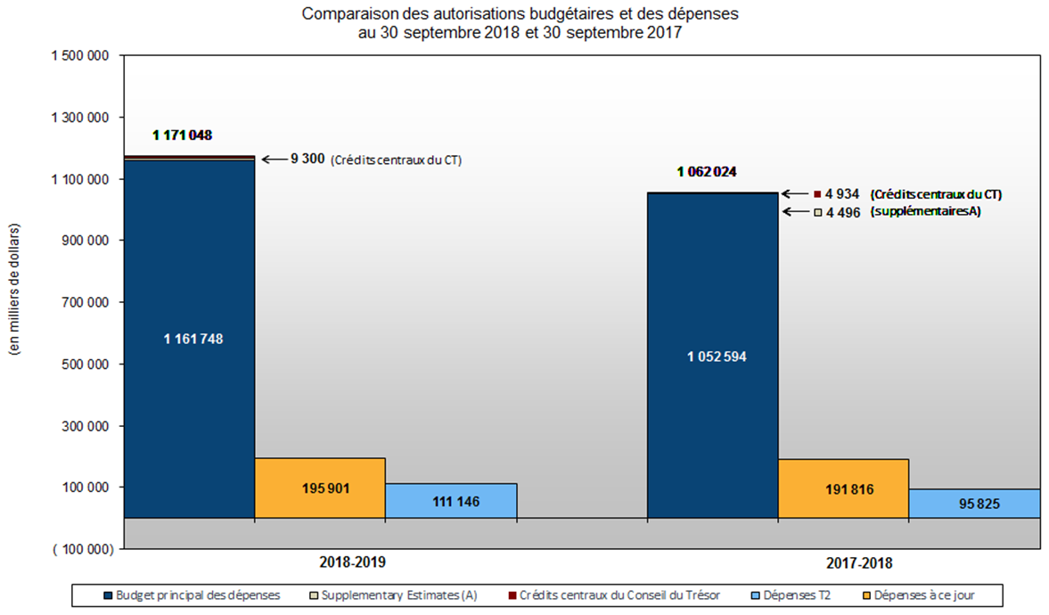 Pour le trimestre terminé le 30 septembre 2018, les niveaux d'autorisations accordés au Ministère comprenaient le Budget principal des dépenses et le Budget 2018. Les niveaux d'autorisations de 2017-2018 pour la même période comprenaient le Budget principal des dépenses, le Budget supplémentaire des dépenses (A) et les transferts de crédits du Conseil du Trésor. L'État des autorisations indique une augmentation nette de 109,0 M$ (10,3 %) par rapport à celles de la même période l'année précédente (de 1 062,0 M$ à 1 171,0 M$).