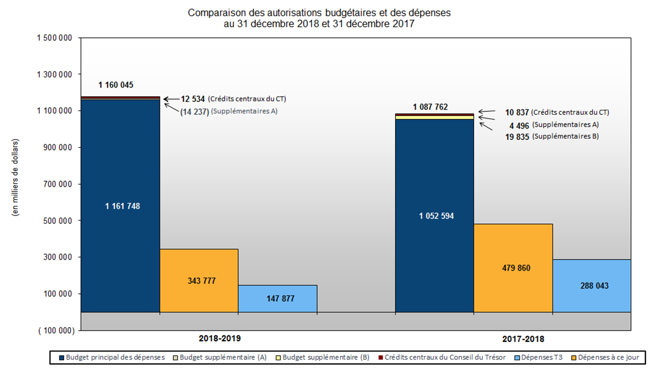 Pour le trimestre terminé le 31 décembre 2018, les niveaux d'autorisations accordés au Ministère comprenaient le Budget principal des dépenses, le Budget 2018, le Budget supplémentaire des dépenses (A) et les transferts de crédits centraux du Conseil du Trésor. Les niveaux d'autorisations de 2017-2018 pour la même période comprenaient le Budget principal des dépenses, le Budget supplémentaire des dépenses (A) et (B) et les transferts de crédits centraux du Conseil du Trésor. L'État des autorisations indique une augmentation nette de 72,3 M$ (6,6 %) par rapport à celles de la même période l'année précédente (de 1 087,8 M$ à 1 160,0 M$).