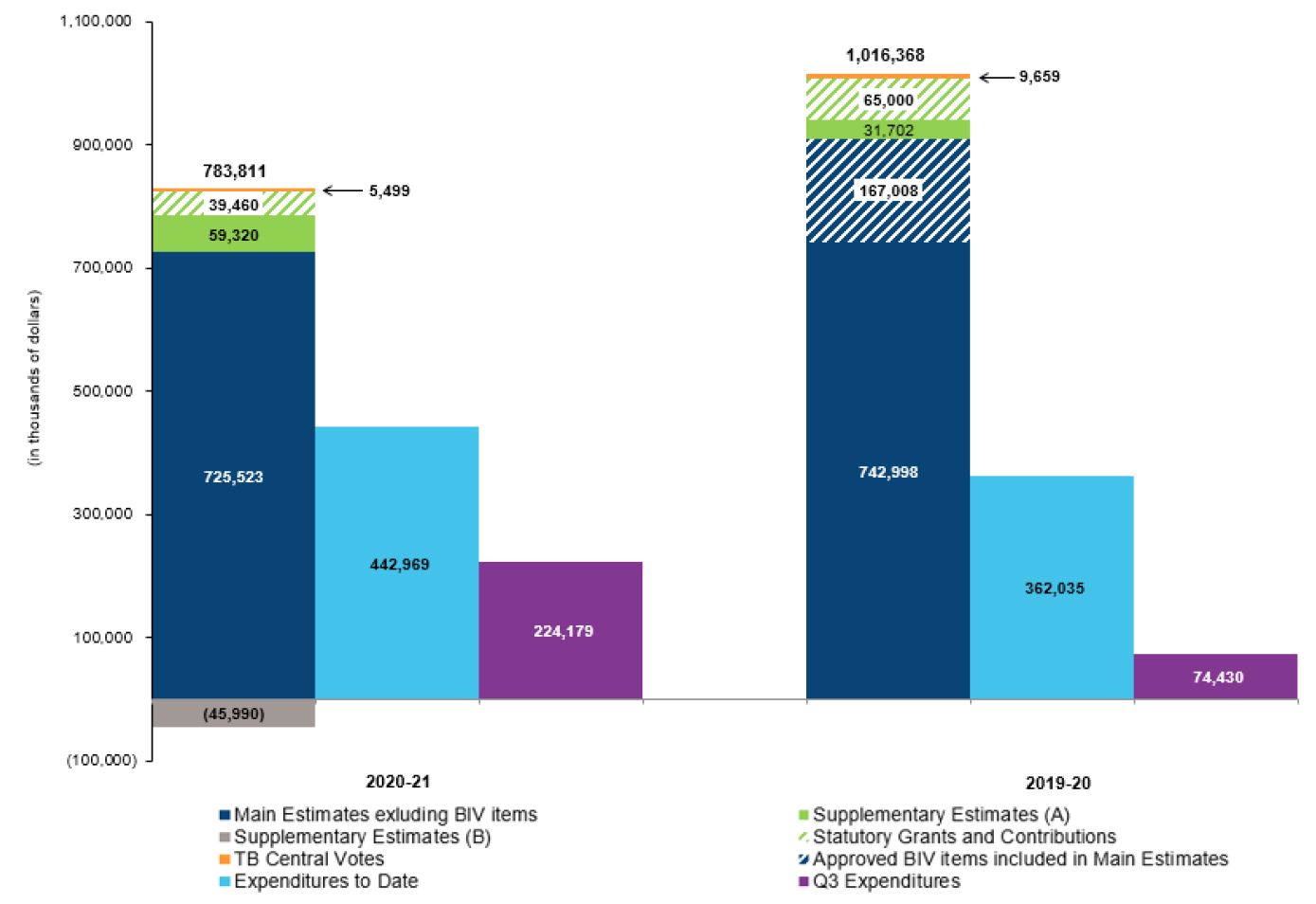 Starting from the left hand side, the “first” column in the graph indicates that the Department authorities are at $783.8 million for fiscal year 2020-21. The year-to-date expenditures of $443.0 million reported at the end of the third quarter of the 2020-21 fiscal year are shown under the “second” column. The expenditures of $224.2 million for the period ended December 31, 2020 (i.e. third quarter) are presented under the “third” column. The “fourth” column in the graph depicts the 2019-20 authorities which were at $1,016.4 million at the end of December 2019. The 2019-20 year-to-date expenditures of $362.0 million reported at the end of the third quarter of the 2019-20 fiscal year are shown under the “fifth” column. The Departments’ actual expenditures incurred in the third quarter of 2019-20 were $74.4 million and are shown under the “sixth” column of the graph.