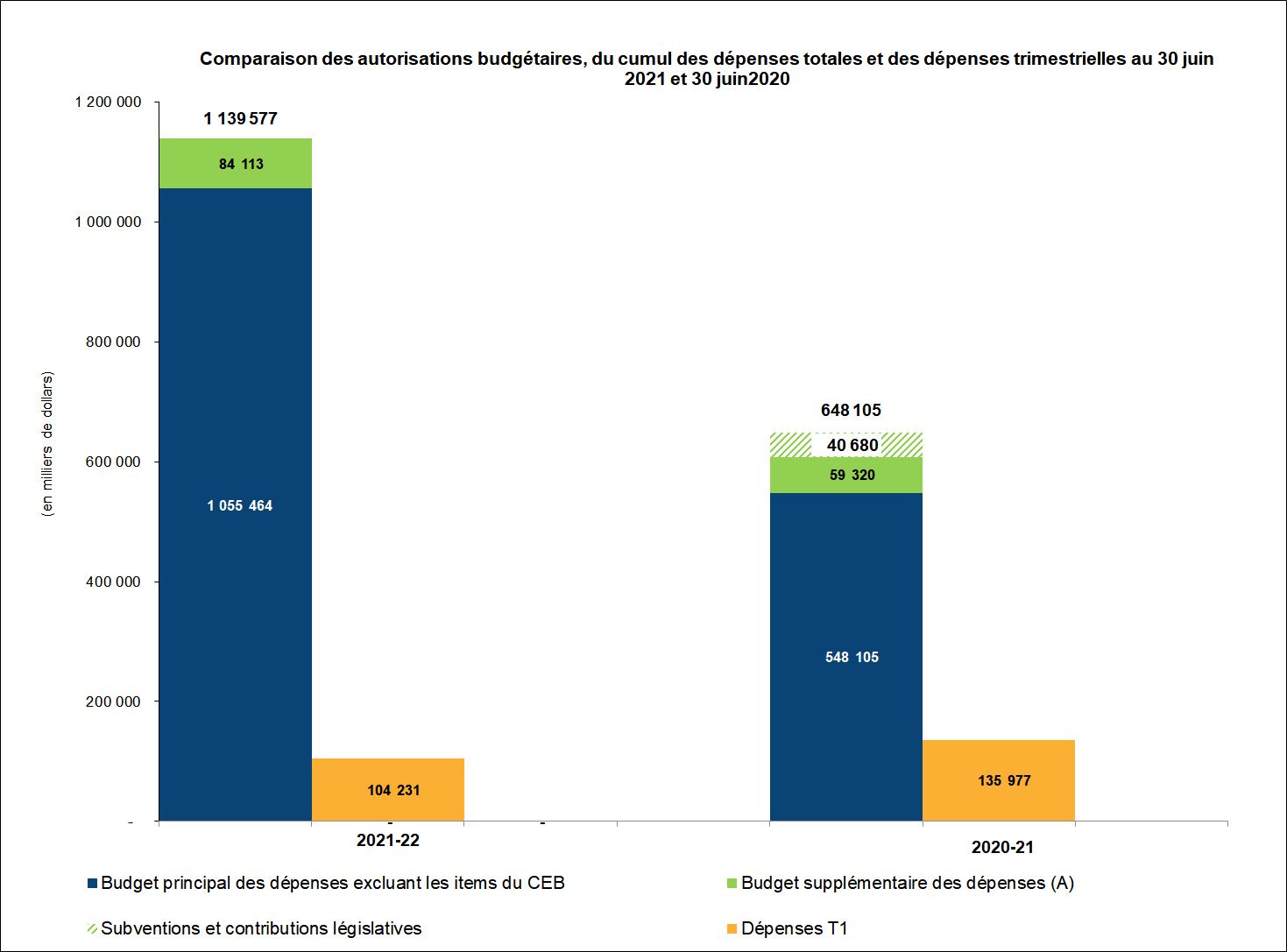Pour le trimestre terminé le 30 juin 2021, les niveaux d’autorisations accordés au Ministère comprennent du Budget principal des dépenses 2021-2022 et le Budget supplémentaire des dépenses (A). Les niveaux d’autorisations de 2020-2021 pour la même période comprenaient 9/12ième du Budget principal des dépenses 2020-2021, le Budget supplémentaire des dépenses (A) et une contribution législative. L’État des autorisations indique une augmentation nette de 491,5 M$ (75,8 %) par rapport à celle de la même période l’année précédente (de 648,1 M$ à 1 139,6 M$).