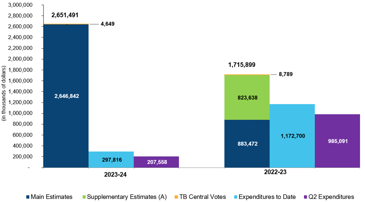 Starting from the left hand side, the “first” column in the graph indicates that the Department authorities are at $2,651.5 million for fiscal year 2023-24. The year-to-date expenditures of $297.8 million reported at the end of the second quarter of the 2023-24 fiscal year are shown under the “second” column. The expenditures of $207.6 million for the period ended September 30, 2023 (i.e. second quarter) are presented under the “third” column. The “fourth” column in the graph depicts the 2022-23 authorities which were at $1,715.9 million at the end of September 2022. The 2022-23 year-to-date expenditures of $1,172.7 million reported at the end of the second quarter of the 2022-23 fiscal year are shown under the “fifth” column. The Departments’ actual expenditures incurred in the second quarter of 2022-23 were $985.1 million and are shown under the “sixth” column of the graph.