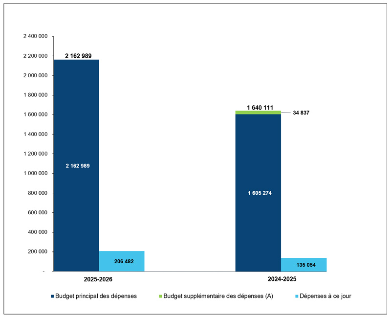 Les autorisations législatives budgétaires ont augmenté de 5,3 M$ (22,7 %) en 2025-2026 principalement en raison du régime d'avantages sociaux des employés associé au nouveau financement des salaires reçu dans le budget principal des dépenses.