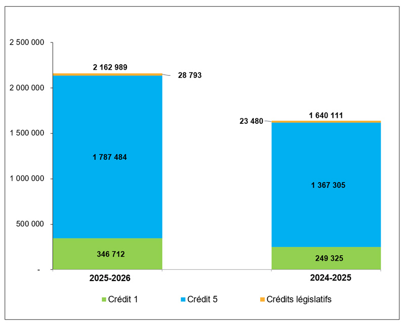 Le graphique ci-dessous fait la comparaison entre le total du crédit 1, du crédit 5 et les crédits législatifs au 30 juin 2025 et au 30 juin 2024.