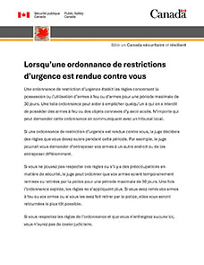 Une ordonnance de restriction d'urgence établit les règles concernant la possession ou l'utilisation d'armes à feu ou d'armes pour une période maximale de 30 jours. Une telle ordonnance peut aider à empêcher quelqu'un à qui on a interdit de posséder des armes à feu ou des objets connexes d'y avoir accès. N'importe qui peut demander cette ordonnance en communiquant avec un tribunal local.