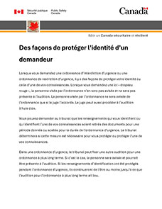 Lorsque vous demandez une ordonnance d'interdiction d'urgence ou une ordonnance de restriction d'urgence, il y a des façons de protéger votre identité ou celle d'une de vos connaissances. Lorsque vous demandez une loi « drapeau rouge », la personne visée par l'ordonnance n'en sera pas avisée et ne sera pas présente à l'audition. La personne visée par l'ordonnance ne sera avisée de l'ordonnance que si le juge l'accorde. Le juge peut aussi procéder à l'audition à huis clos.