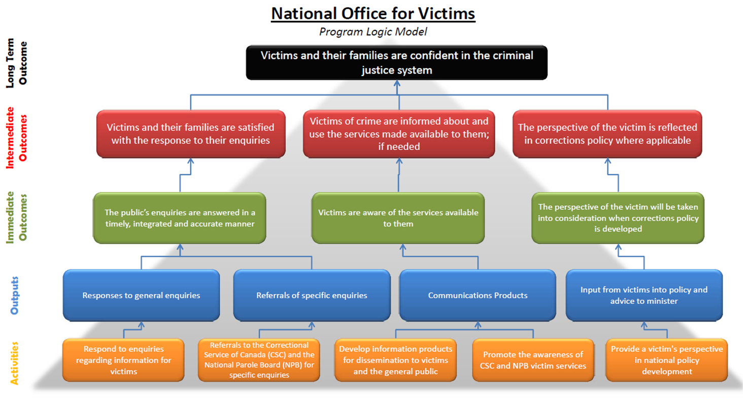 The 2014 logic model found in Annex A illustrates the activities and outputs needed to contribute towards the fulfilment of the NOV's long-term objective that victims and their families are confident in the criminal justice system. This objective is facilitated through the achievement of the following intermediate outcomes: