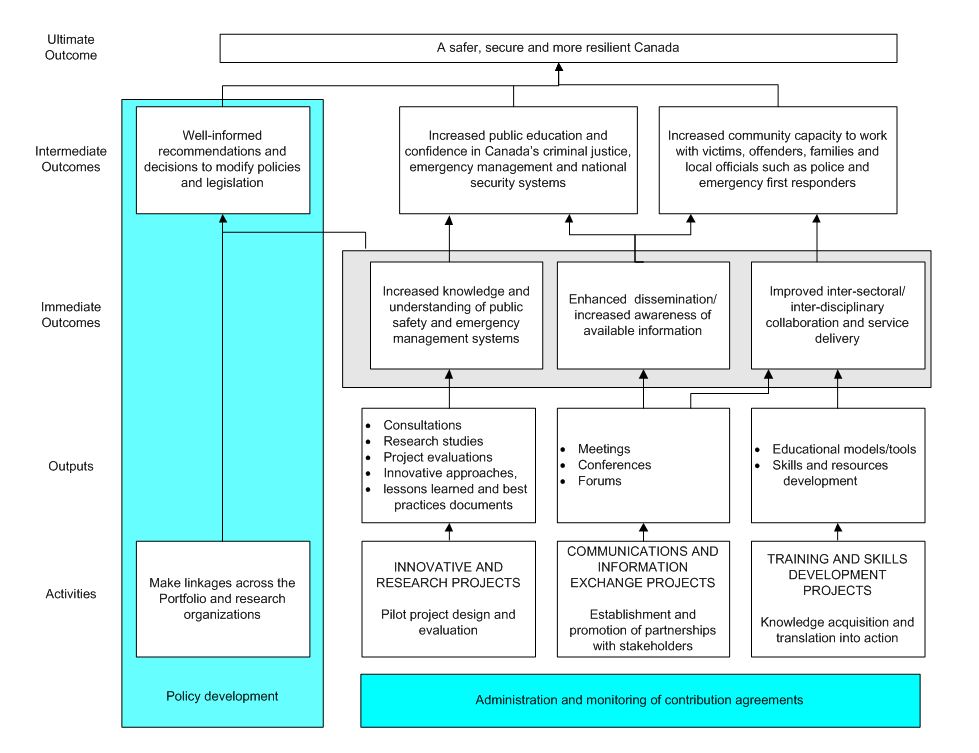 The immediate outcomes lead to the following intermediate outcomes: well informed recommendations and decisions to modify policies and legislation; increased Public Education and Confidence in Canada's Criminal Justice, emergency management and national security systems; increased community capacity to work with victims, offenders, families, and local officials such as police and emergency responders.