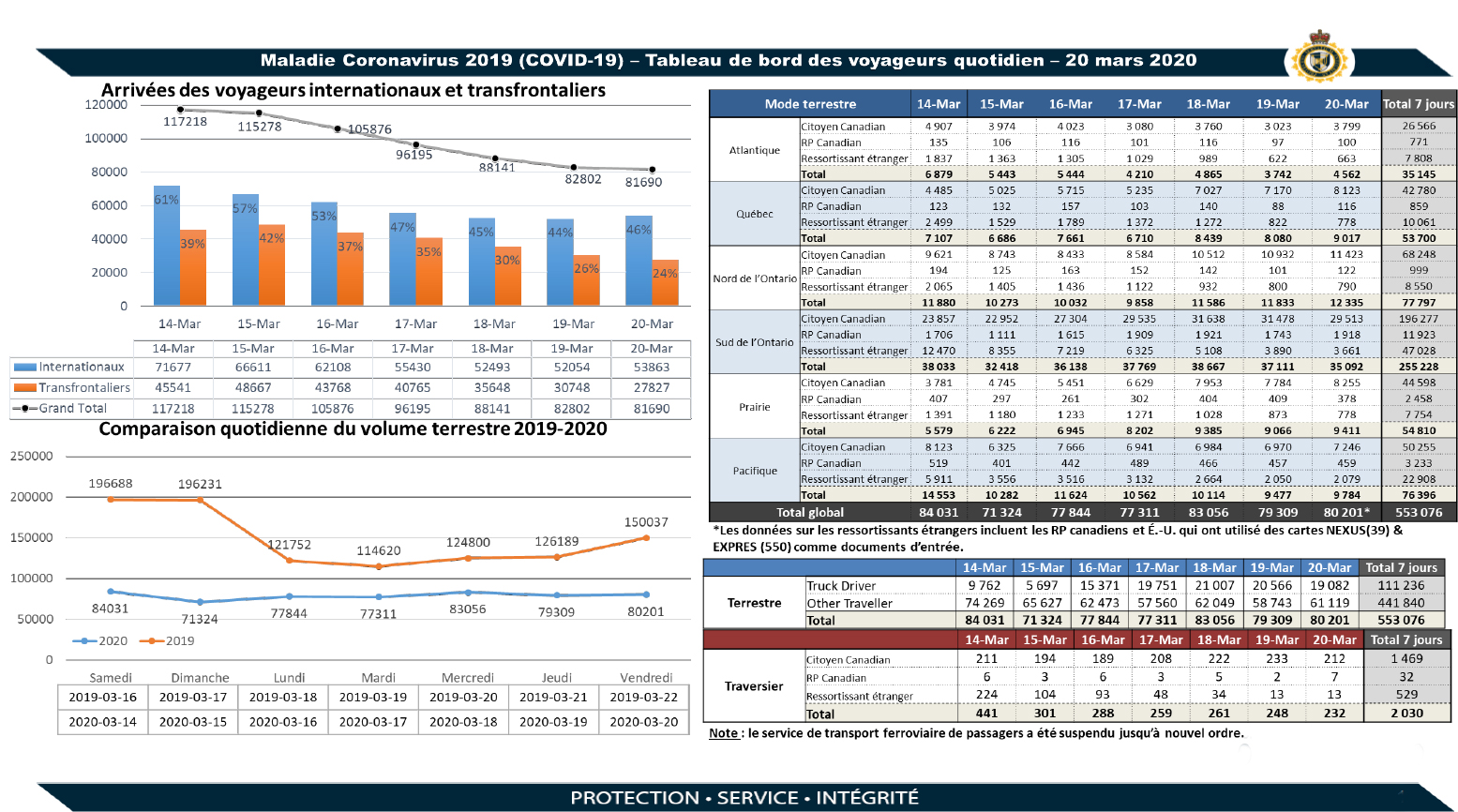 Maladie Coronavirus (COVID-19) - Tableau de bord des voyageurs quotidien - 20 mars 2020