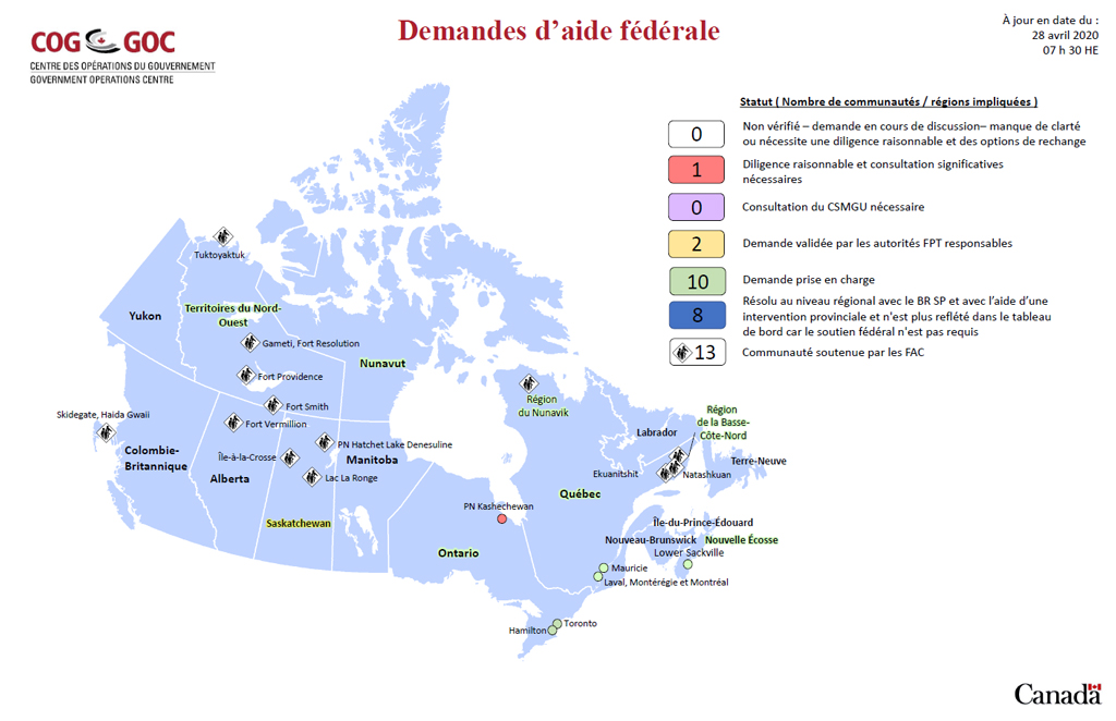 Cette carte du Canada produite par le Centre des opérations du gouvernement montre les provinces et territoires qui ont des demandes d’aide fédérale ainsi que les villes qui ont besoin d’un soutien communautaire de la part des Forces armées canadiennes (FAC). Cette carte est à jour en date du 28 avril 2020, 7 h 30 HAE.