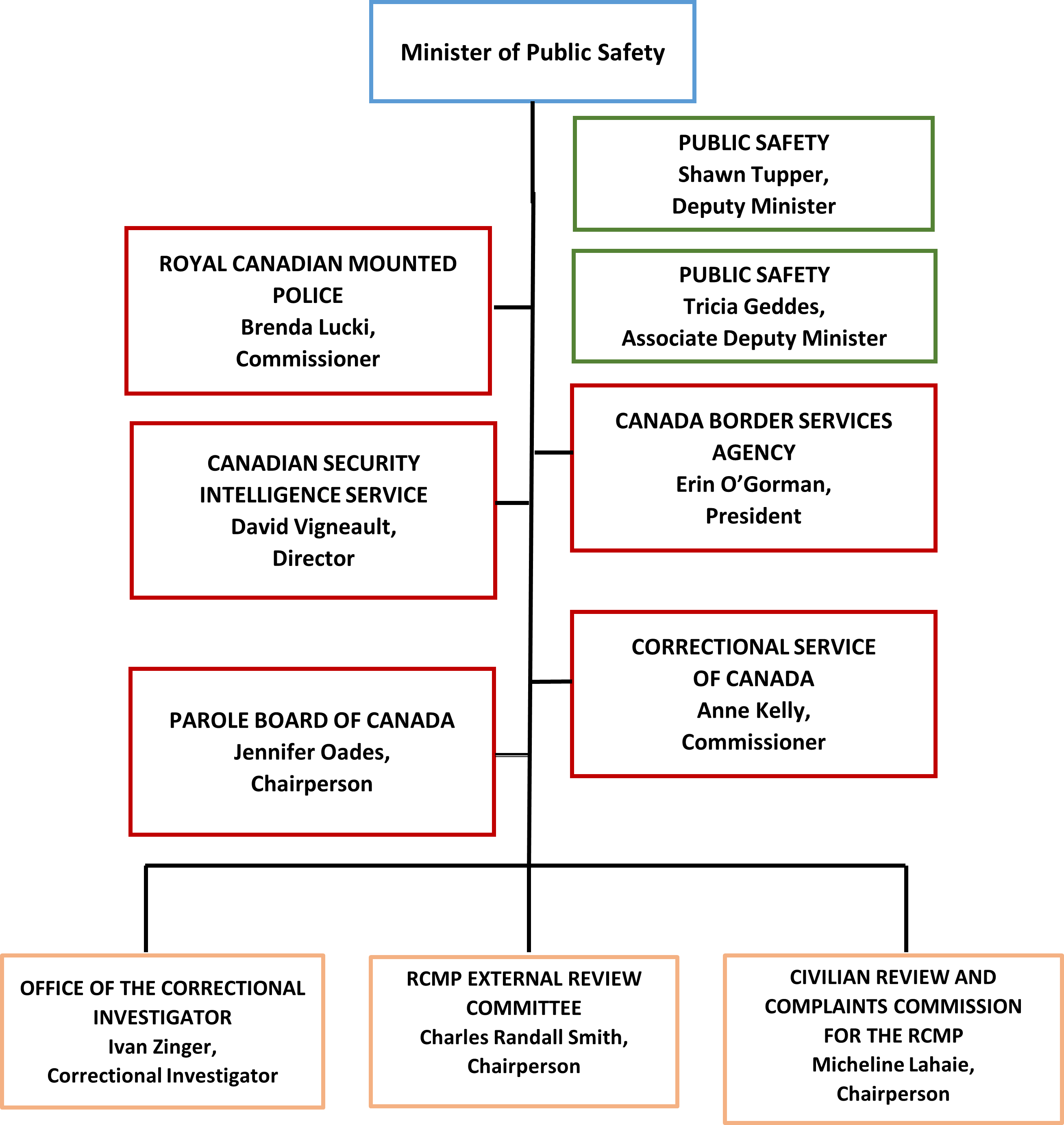 The Public Safety Portfolio is composed of the Department of Public Safety and Emergency Preparedness (the Department, PS) and five agencies: Royal Canadian Mounted Police (RCMP), the Correctional Service of Canada (CSC), the Canada Border Services Agency (CBSA), the Canadian Security Intelligence Service (CSIS), and the Parole Board of Canada (PBC), and three review bodies: the Civilian Review and Complaints Commission for the RCMP (CRCC), the Office of the Correctional Investigator (OCI), and the RCMP External Review Committee (ERC).
