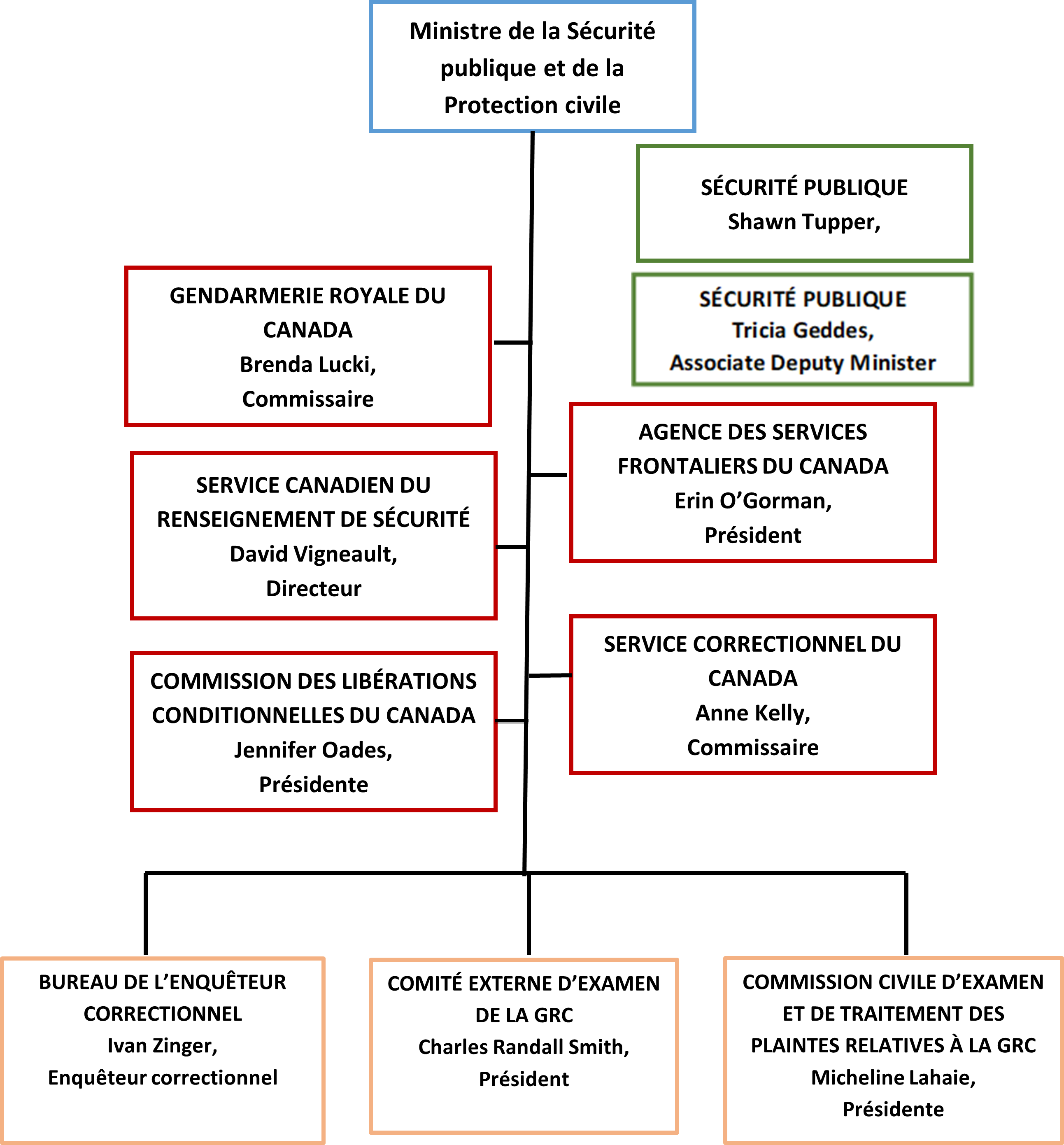Le Portefeuille est composé du ministère de la Sécurité publique et de la Protection civile (le Ministère , ou « SP »), de cinq organismes : la Gendarmerie royale du Canada (GRC); le Service correctionnel du Canada (SCC); l'Agence des services frontaliers du Canada (ASFC); le Service canadien du renseignement de sécurité (SCRS); et la Commission des libérations conditionnelles du Canada (la Commission, ou « CLCC »), et de trois organes d'examen : la Commission civile d'examen et de traitement des plaintes relatives à la GRC (CCETP), le Bureau de l'enquêteur correctionnel (BEC) et le Comité externe d'examen de la GRC (CEE).