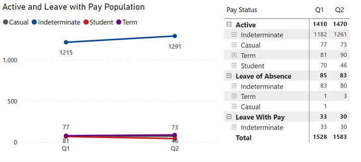 The total number of employees for Q2 is: Active Indeterminate: 1261, Active Casual: 73, Active Term: 90, Active Student: 46 for a total of 1470. Leave of Absence Indeterminate: 80, Leave of Absence Term: 3 for a total of 83. Leave with Pay Indeterminate: 30.
