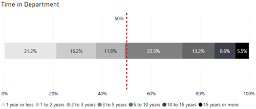 The Time in Department bar chart represents the percentage of how long an employee is staying at Public Safety. The percentages are as follows: 21.2% 1 year or less, 16.2% between 1-2 years, 11.8% between 2-3 years, 23.5% between 3-5 years, 13.2% between 5-10 years, 8.6% between 10-15 years and 5.5% 15 years or more.