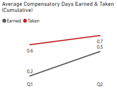 The Average Compensatory Days Earned and Taken (Cumulative) line graph shows how many days were earned and taken cumulatively for Q1 and Q2 of FY 2022-23. The following is the number of days earned and taken: Q1 earned 0.2 days and 0.6 days taken. Q2 earned 0.5 days and 0.7 days taken (the total for Q2 is cumulative with Q1).