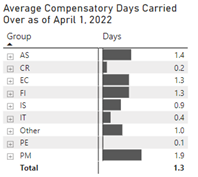 The Average Compensatory Days Carried Over as of April 1, 2022 table shows the average total of compensatory time in days that employees have carried over by group. The following is the number of days carried over by group: AS: 1.4, CR: 0.2, EC: 1.3, FI: 1.3, IS: 0.9, IT: 0.4, Other: 1.0, PE: 0.1, PM: 1.9, with the total for all groups being 1.3 days.