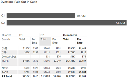 The overtime paid out in cash table shows a breakdown for the amount paid out by quarter, branch, and per employee with a cumulative amount. The dollar amounts per branch for Q1 and Q2 as follows: Q1 CMB total $150K and per employee $548, CPB total $63K and per employee $297, DMO/IAE/LS total $0 and per employee 0, EMPB total $450 and per employee $1,138, NCSB total $63K and per employee $373, PACB total $71K and per employee $394, PS total $752K and per employee $610; Q2 CMB total $246K and per employee $901, CPB total $111K and per employee $521, DMO/IAE/LS total $3K and per employee $76, EMPB total $730 and per employee $2,049, NCSB total $106K and per employee $623, PACB total $124K and per employee $689, PS total $1,319K and per employee $1,070.