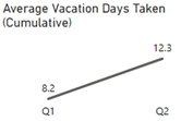 The Average Vacation Days Taken (Cumulative) line graph shows how many vacation days on average were taken cumulatively for Q1 and Q2 of FY 2022-23. The following is the number of days taken: Q1 8.2 days and for Q2 12.3 days (the total for Q2 is cumulative with Q1).