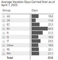 The Average Vacation Days Carried Over as of April 1, 2022 table shows the average number of vacation days carried over from the previous fiscal by group with a total. The following is the average vacation days by group: AS is 19.6, CR is 11.6, EC is 22.5, EX is 45.5, FI is 31.2, IS is 19.0, IT is 25.0, Other is 19.0, PE is 20.1 and PM is 21.1, with a total average vacation days carried over of 23.0.