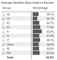 The Average Vacation Days Used versus Earned table shows the percentage of vacation used compared to earned by group. The percentages are as follows: AS is 56.1%, CR is 44.1%, EC is 62.7%, EX is 71.4%, FI is 85.4%, IS is 61.6%, IT is 69.1%, Other is 56.6%, PE is 60.4% and PM is 65.5%, with a total average vacation days used versus earned of 62.8%.