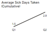 The Average Sick Days Taken (Cumulative) line graph shows how many sick days were taken cumulatively for Q1 and Q2 of FY 2022-23. The following is the average number of days taken: Q1 1.5 days and for Q2 2.9 days (the total for Q2 is cumulative with Q1).