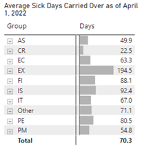 The Average Sick Days Carried Over as of April 1, 2022 table shows the number of sick days taken by group with a total. The following is the average sick days by group: AS is 49.9, CR is 22.5, EC is 63.3, EX is 194.5, FI is 88.1, IS is 92.4, IT is 67.0, Other is 71.1, PE is 80.5 and PM is 54.8, with a total average sick days carried over of 70.3.