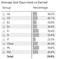 The Average Sick Days Used versus Earned table shows the percentage of sick used versus earned by group. The percentages are as follows: AS- is 38.3%, CR is 42.1%, EC is 33.8%, EX is 38.6%, FI is 50.4%, IS is 55.6%, IT is 23.5%, Other is 45.0%, PE is 56.6% and PM is 45.9%, with a total average sick days used vs earned of 39.8%.