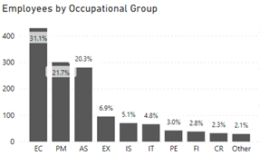Employees by Occupational Group is a bar graph which shows employees by Occupational Group in Public Safety for FY 2022-2023 (April 1 to September 30, 2022). The percentages as well as the number of employees are as follows: EC is 31.1% or 429 employees, PM is 21.7% or 300 employees, AS is 20.3% or 280 employees, EX is 6.9% or 95 employees, IS is 5.1% or 70 employees, IT is 4.8% or 66 employees, PE is 3.0% or 42 employees, FI is 2.8% or 38 employees, CR is 2.3% or 32 employees and Other is 2.1% or 29 employees.