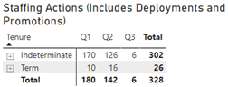 The Staffing Actions which includes deployments and promotions table shows the total number of long term (indeterminate and term) staffing actions for Q1, Q2 and Q3 (April 1, 2022 to October 4, 2022). The table shows the following: 170 indeterminate and 10 term actions for Q1 with a total of 180 actions; 126 indeterminate and 16 term actions for Q2 for a total of 142 actions; 6 indeterminate actions for Q3 with a total of 6 actions. The total indeterminate actions for all quarters is 302, and the total term actions for all quarters 26 for a grand total of 328 actions.
