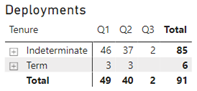 The Deployments table shows indeterminate and term deployments staffing actions for Q1, Q2 and Q3 (April 1, 2022 to October 4, 2022). The table shows the following: 46 indeterminate and 3 term deployments for Q1 with a total of 49; 37 indeterminate and 3 term deployments for Q2 for a total of 40; 2 indeterminate deployments for Q3 with a total of 2. The total indeterminate deployments for all quarters is 85, and the total term deployments for all quarters is 6 for a total of 91 deployments.