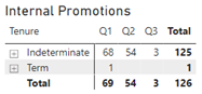 The Internal Promotions table shows promotions for Q1, Q2 and Q3 (April 1, 2022 to October 4, 2022). The table shows the following: 68 indeterminate and 1 term internal promotion for Q1 with a total of 69; 54 indeterminate internal promotions for Q2 for a total of 54; 3 indeterminate internal promotions for Q3 with a total of 3. The total indeterminate internal promotions for all quarters is 125, and the total term internal promotions for all quarters is 1 for a total of 126 internal promotions.