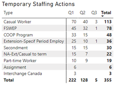 The Temporary Staffing Actions table shows the type and number of temporary staffing actions for Q1, Q2 and Q3 (April 1, 2022 to October 4, 2022). The table shows the following breakdown by type of action: Casual worker Q1-70 actions, Q2-40 actions, Q3-3 actions for a total of 113. FSWEP Q1-45 actions, Q2-32 actions, Q3-1 action for a total of 78. COOP Program Q1-33 actions, Q2-15 actions for a total of 48. Extension-specif Period Employ Q1-25 actions, Q2-10 actions, Q3-1 action for a total of 36. Secondment Q1-15 actions, Q2-15 actions for a total of 30. NA-Ext/Casual to term Q1-15 actions, Q2-7 actions, for a total of 22. Part-time worker Q1-10 actions, Q2-9 actions for a total of 19. Assignment Q1-6 actions for a total of 6. Interchange Canada Q1-3 actions for a total of 3. Total actions for Q1-222, Q2-128, Q3-5 for a total of 355 temporary staffing actions.