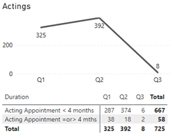 The Actings line graph shows the total number of acting appointments by duration – less than 4 months as well as acting appointments equal to or more than 4 months. The numbers are as follows: Q1 had a total of 325 actings, Q2 392 and Q3 8. The table shows the following detailed breakdown: Q1 had 287 acting appointments of less than 4 months, 374 for Q2 and 6 for Q3 with a total for all quarters of 667 actings. Q1 had 38 acting appointments equals to or more than 4 months, 18 for Q2 and 2 for Q3 with a total for all quarters of 58.