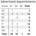 The Advertised Appointments table by group for Q1, Q2 and Q3 includes the total number of appointments as follows: advertised appointments by quarter and group Q1 – AS 1, EC 15, EX 4, FI 2, IT 12, PE 2, PM 9 for a total of 28; Q2 - AS 0, EC 5, EX 4, FI 0, IT 3, PE 1, PM 3 for a total of 16; Q3 - AS 0, EC 1, EX 0, FI 0, IT 0, PE 0, PM 0 for a total of 1. The total advertised appointments by group – AS 1, EC 15, EX 4, FI 2, IT 12, PE 2, PM 9 for a total of 45 advertised appointments.