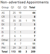 The Non-advertised Appointments by group for Q1, Q2 and Q3 table includes the total number of appointments as follows: non-advertised appointments by quarter and group Q1 – AS 25, CR 6, EC 35, EX 3, FI 2, IS 1 IT 6, Other 2, PE 4, PM 29 for a total of 113; Q2 - AS 19, CR 2, EC 35, EX 2, FI 0, IS 1 IT 1, Other 2, PE 7, PM 24 for a total of 93; Q3 - AS 0, CR 0, EC 1, EX 0, FI 0, IS 0 IT 0, Other 0, PE 0, PM 0 for a total of 2. The total non-advertised appointments by group – AS 44, CR 8, EC 71, EX 5, FI 2, IT 7, Other 4, PE 11, PM 55 for a total of 209 non-advertised appointments.