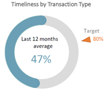 The Timeliness by Transaction Type donut shows the average percentage of timely transactions being 47% within the last 12 months with a target of 80%.