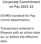 The Corporate Commitment image on pay 2021-22 explains the standard for OCHRO standards for Pay Centre departments which is transactions entered in Phoenix with an action date on, or before the effective date.