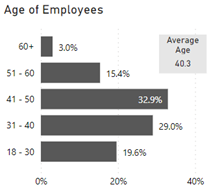 The Age of Employees bar graph shows the percentage age of employees in age range groups as well as the average age being 40.3. The percentage is as follows: Age 60+ 3.0%, 51-60 15.4%, 41-50 32.9%, 31-40 29.0% and 18-30 19.6%.