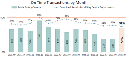 The On Time Transactions by Month bar graph shows the percentage results of on time transactions for Public Safety Canada as well as combined results for all Pay Centre departments starting from September 2021 to September 2022. The percentage is as follows: Public Safety 2021-09 53%, 2021-10 56%, 2021-11 50%, 2021-12 73%, 2022-01 58%, 2022-02 54%, 2022-03 46%, 2022-04 54%, 2022-05 51%, 2022-06 41%, 2022-07 31%, 2022-08 30% and 2022-09 56%. The percentage combined for all Pay Centre departments is as follows: 2021-09 65%, 2021-10 63%, 2021-11 67%, 2021-12 80%, 2022-01 67%, 2022-02 73%, 2022-03 77%, 2022-04 70%, 2022-05 68%, 2022-06 66%, 2022-07 61%, 2022-08 62% and 2022-09 59%.