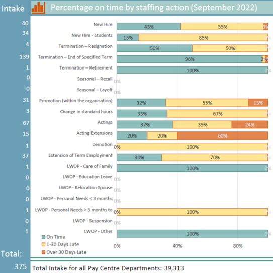 The percentages by action type are as follows: New Hire 43% on time, 55% 1-30 days late, 3% over 30 days late; New Hire – Students 15% on time, 85% 1-30 days late; Termination – Resignation 50% on time, 50% 1-30 days late; Termination – End of specified term 90% on time, 2% 1-30 days late, 2% over 30 days late; Termination Retirement 100% on time; Promotion (within the organization) 32% on time, 55% 1-30 days late, 13% over 30 days late; Change in standard hours 33% on time, 67% 1-30 days late; Actings 37% on time, 39% 1-30 days late, 24% over 30 days late; Acting extensions 20% on time, 20% 1-30 days late, 60% over 30 days late; Demotion 100% on time; Extension of term employment 30% on time, 70% 1-30 days late; LWOP – Care of Family 100% on time; LWOP – personal needs > 3 months 100% 1-30 days late; LWOP - Other 100% on time.